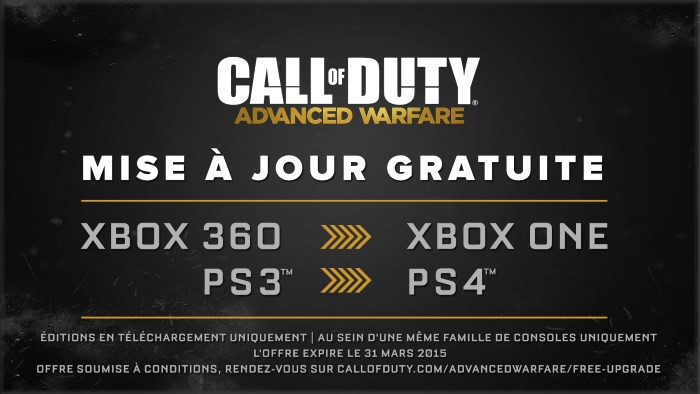 Les acheteurs d'une édition numérique de Advanced Warfare sur Xbox 360 et PS3 auront ainsi jusqu'au 31 mars 2015 s'ils souhaitent passer à la génération suivante.